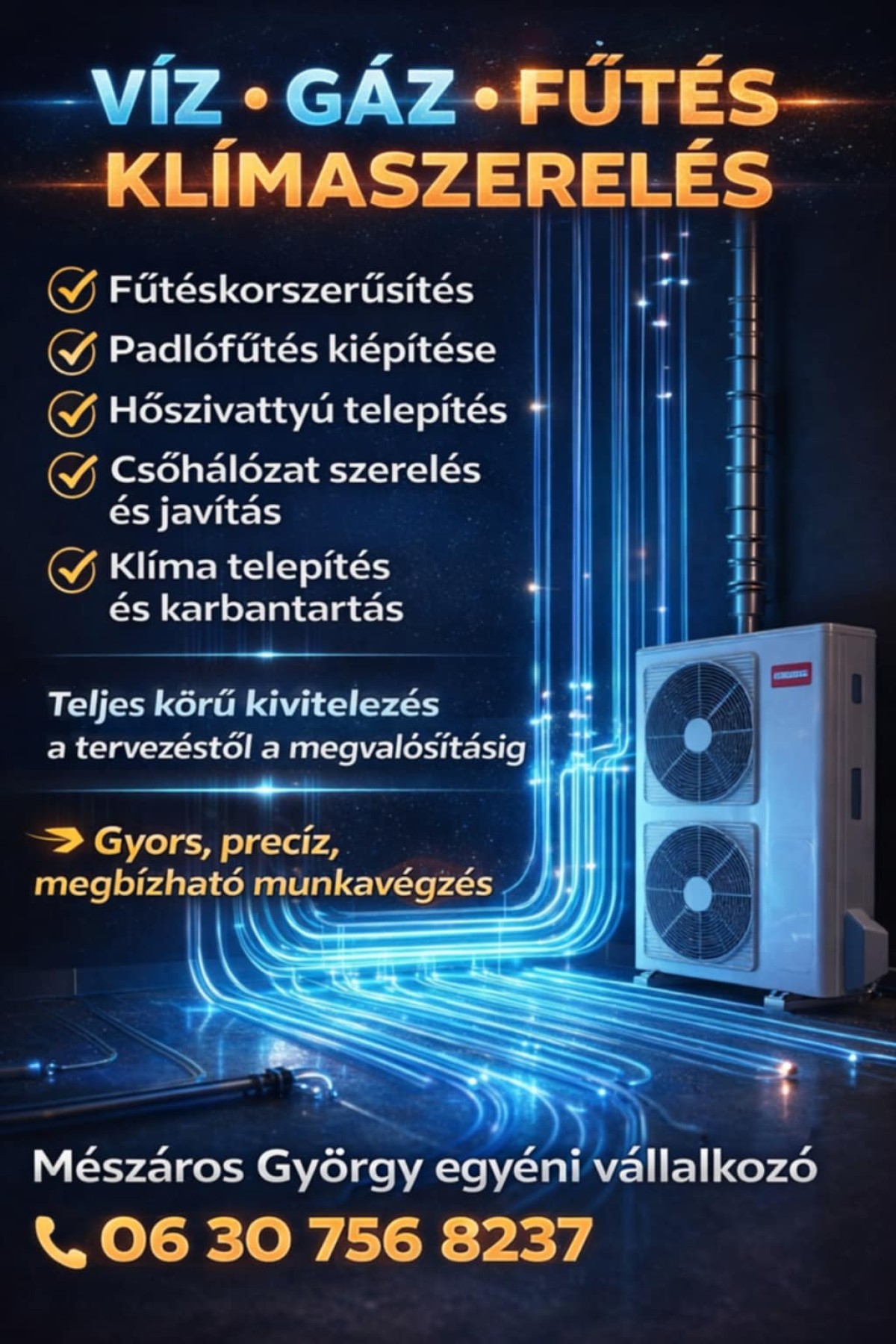 Több éves szakmai tapasztalattal vállalom családi házak és lakások komplett gépészeti kivitelezését és felújítását. Munkám során a precizitásra, megbízhatóságra és tartós megoldásokra törekszem. Legyen szó klímaszerelésről, fűtéskorszerűsítésről vagy víz- és gázszerelésről, nálam a minőség az első.